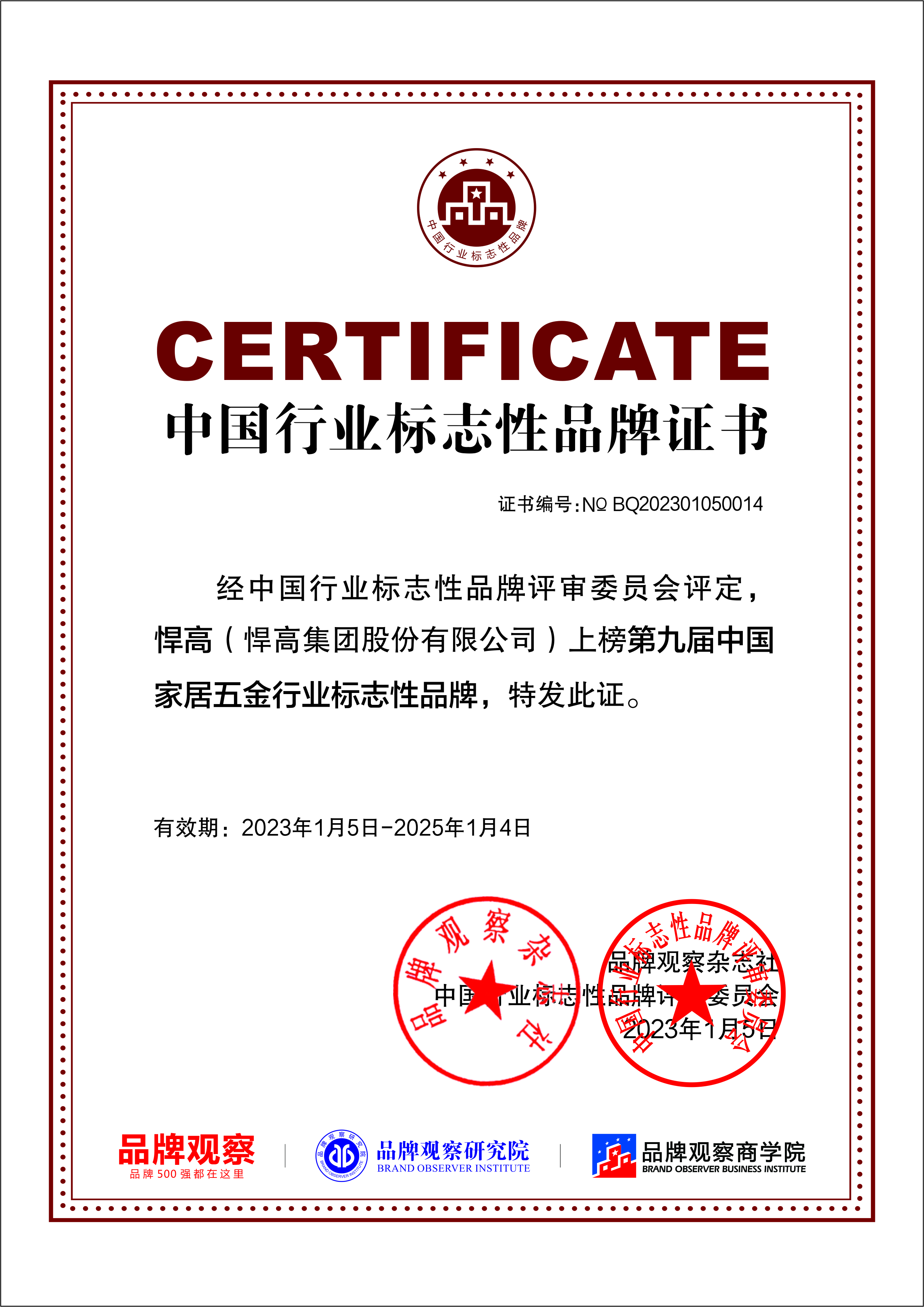 近日,第九届中国行业标志性品牌榜单正式揭晓,继荣获“中国十大家居品牌”后,悍高荣膺“中国家居五金行业标志性品牌”,标志性品牌榜单,每个行业仅一个品牌当选 天堂视频,代表行业冠军。