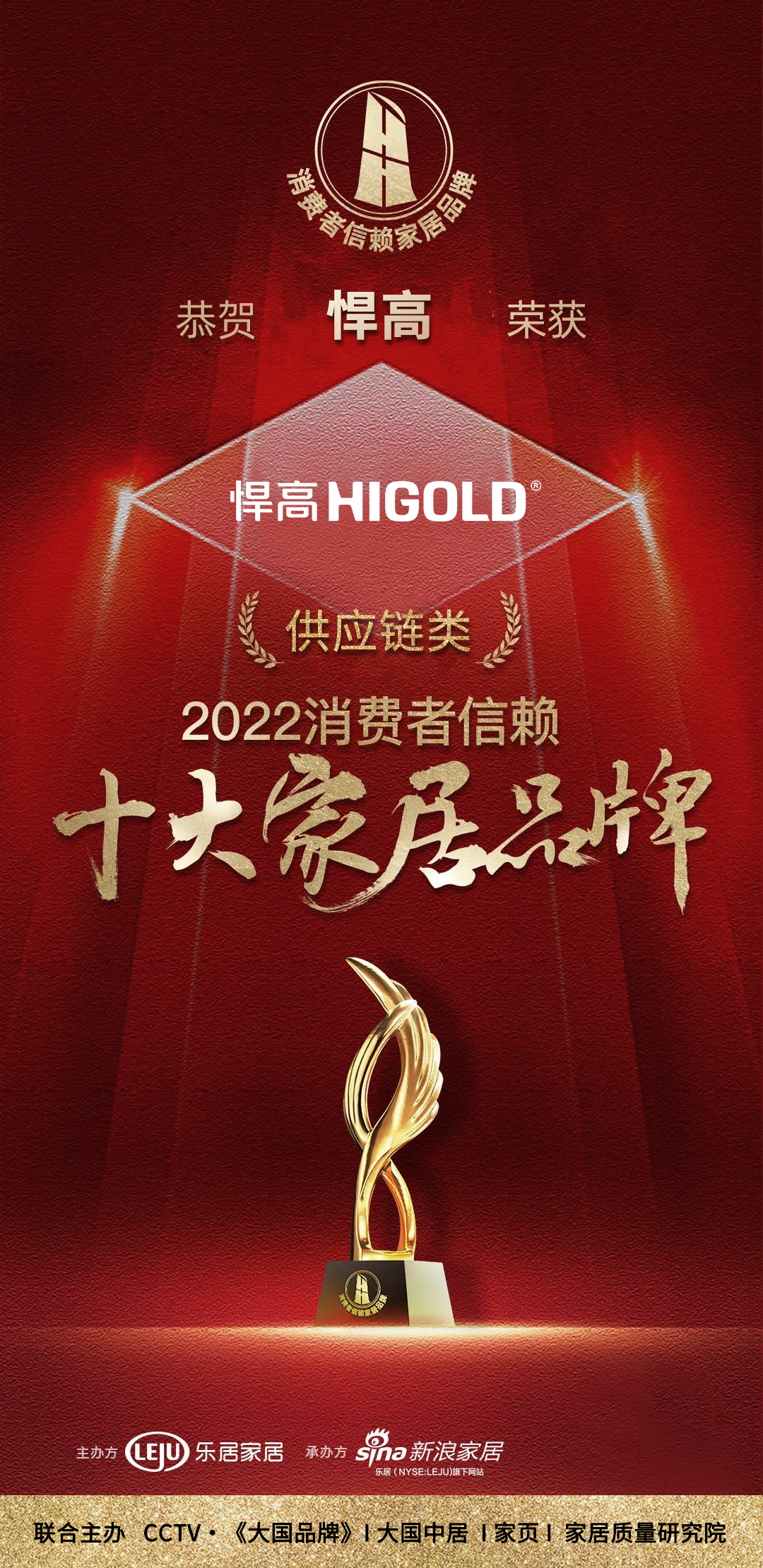 近日,悍高集团凭借自身卓越实力荣登“2022消费者信赖十大家居品牌”供应链类榜单,本次评选活动由乐居家居,新浪家居 天堂视频,CCTV《大国品牌》等单位联合主办,成功获此殊荣,是行业和消费者对悍高产品的高度认可,彰显了强劲的品牌竞争力和悍高稳步向前的发展新态势。