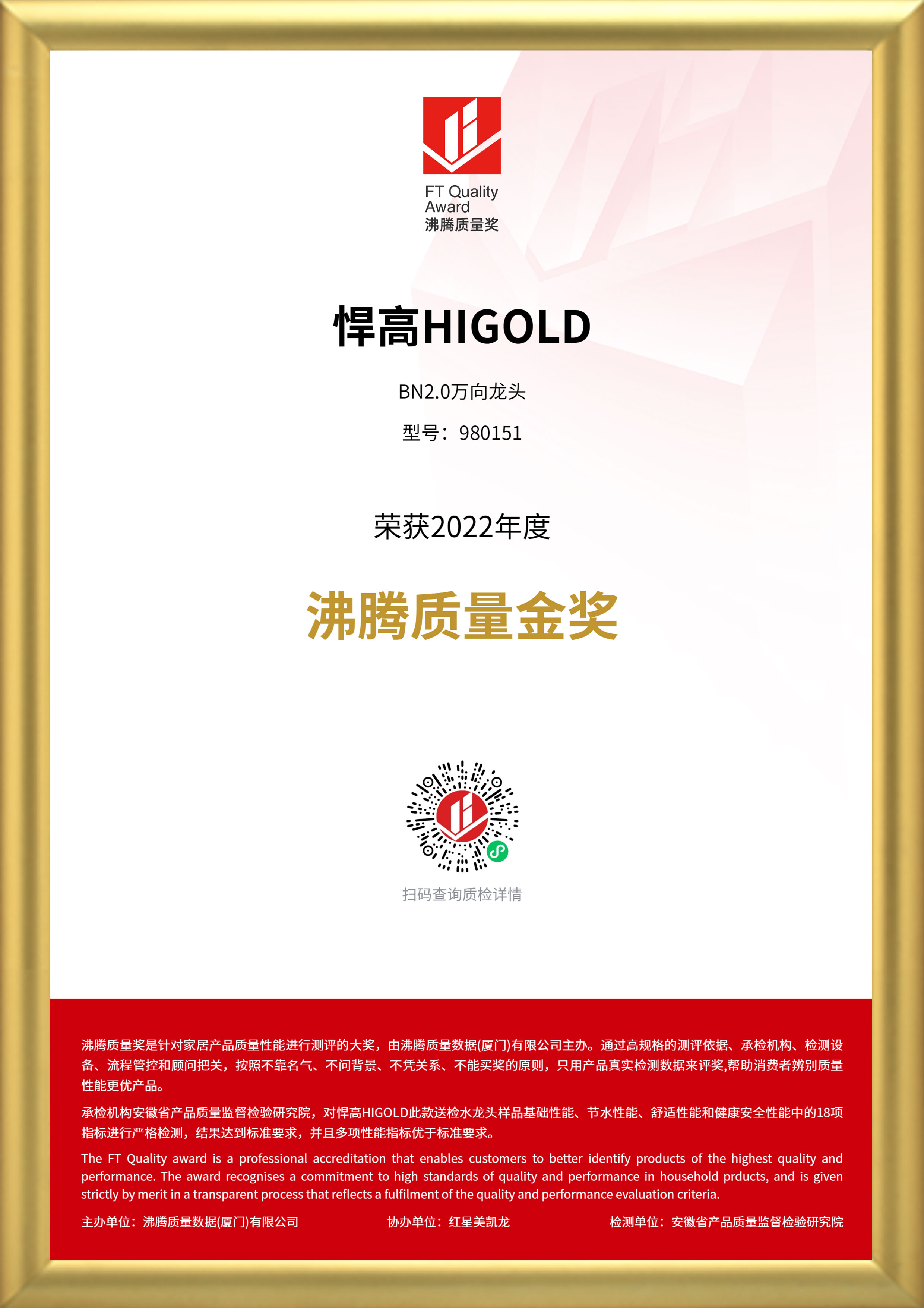 “沸腾质量奖”是针对家居产品质量性能进行测评的大奖,通过聚焦消费痛点,以高规格的测评依据,承检机构,检测设备,流程管控和顾问把关,秉持客观,严谨,公正的态度和“精工品质 用数据说话”的宗旨,筛选质量性能更优的家居好产品,其中,“沸腾质量金奖”是沸腾质量奖测评中的重磅奖项,代表了该品类当前质量风向标 天堂视频免费观看。